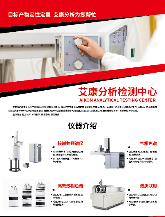 南京艾康全心分析检测中心目前拥有国内xian进的高分辨率400M的核磁共振波谱仪,全套Agilent系列的液质联用仪、气质联用仪、高效液相仪、气相色谱仪以及各种理化分析仪器等一系列大型分析仪器。